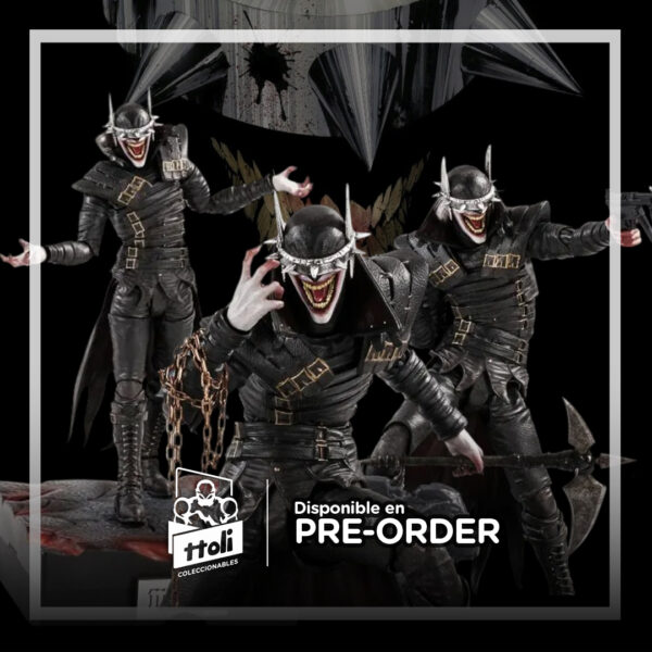 La figura LPZZ Dark Nights Metal El Batman que Ríe a escala 1/12 es una action figure altamente detallada y articulada del icónico villano de DC Comics (híbrido siniestro de Batman y Joker). Presenta esculpido fiel al cómic, pintura precisa y amenazante, dos cabezas intercambiables (boca cerrada y sonrisa maníaca), más de 15 manos extras, accesorios como guadaña, daga, subfusil, jeringa, cadenas con ganchos y base con placa magnética. Ideal para coleccionistas que buscan calidad premium en 1/12 (aprox. 16-17 cm).
